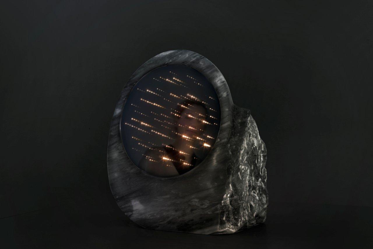 Under certain lighting conditions, the matrix works as a mirror – a regular reflective glass surface, but as its environment darkens, the mirror transforms into a deep, dark tunnel, lit up with an irregular sprinkling of light to reveal its enigmatic and obscure essence.